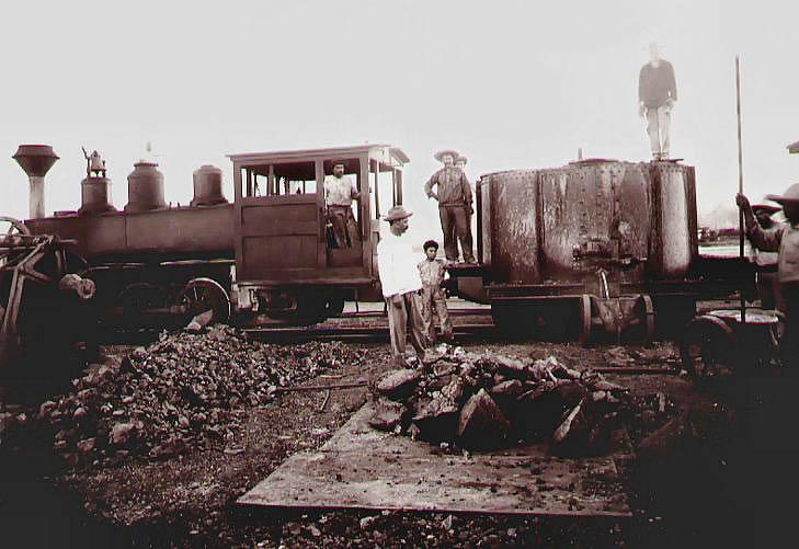 Obreros y operadores de las muy comunes locomotoras utilizadas en el acarreo de mineral desde las diversas zonas de mina a la fundición |