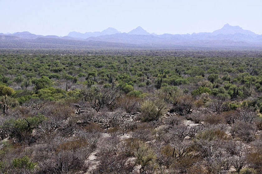 | Una vista más cerrada del campamento de San Bruno, todo ese monte inmediato tiene características de terreno apto para la agricultura, esta característica del sitio y el agua cercana fueron, probablemente, lo que hizo que los exploradores se quedaran en este sitio que, después de todo debieron abandonar derrotados por el agresivo medio. Desde este sitio Kino y acompañantes organizaron algunas exploraciones, en una de ellas llegaron hasta el Océano Pacífico no sin graves dificultades por el tipo de terreno que debieron enfrentar. Hay que estar ahí para imaginarse a ciencia cierta esa dificultad. |