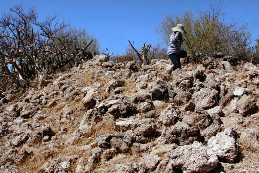 | Aspectos del montículo de piedras en la primera elevación de la pequeña loma, aquí ALP bajado del sitio donde se encuentra y aprecia levemente la plataforma que debió ser el piso de alguno de los recintos. Todas las piedras que se encuentran en ese lugar son evidentemente nada hecho de forma natural, es evidente el acarreo y acomodo de las mismas para el fin que se conoce y la historia consigna. |
