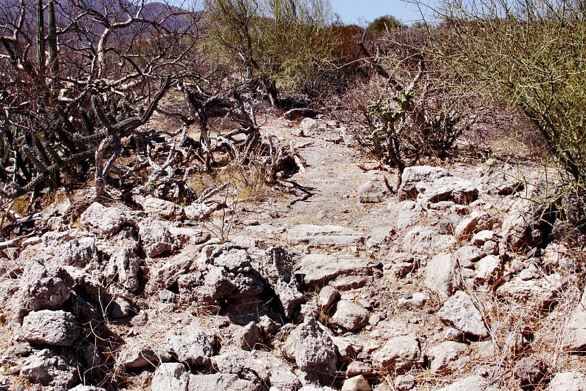 | Aquí se aprecia claramente la plataforma de tierra que la precaria construcción tenía, la cual estaba bordeada con piedras. En sus laterales de piedras o mejor dicho terrones de tepetate con conchas fosilizadas al por mayor, dejaba algunos espacios para ser bordeado por el exterior antes de que la inclinación abruta del terreno se produjera. Esa época del año, en la cual llegan los expedicionarios, también correspondía a una de gran felicidad para los nativos ya que, la temporada de pitahayas agrias estaba iniciando, acababa de pasar, unos dos mese y medio atrás la temporada de la pitahaya dulce, y las gramíneas silvestres, entre ellas el famoso y poco conocido pero seguramente abundante "teddá,"estaban también en su apogeo por la recién pasada temporada de lluvias. |