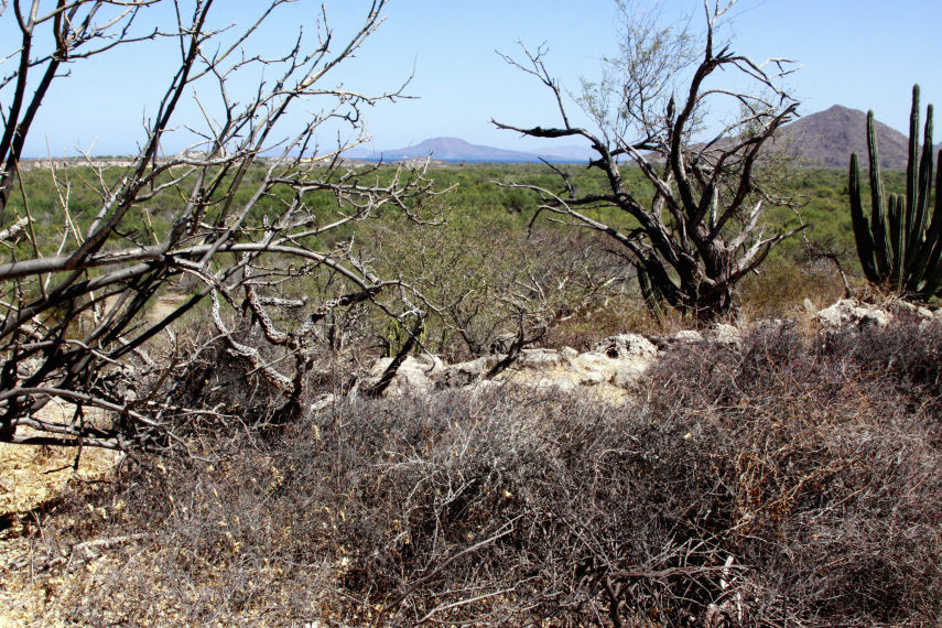 | Otra vista del entorno y parte de los restos del fuerte o campamento de Kino y Antillón, al fondo la isla de Los Coronados. La gran boca de arroyo o delta llamada Boca de San Bruno es la desembocadura de varios arroyos que llegan a sacar su agua en este punto, los tres más grandes son el de San Juan Londó, San Vicente y el de El Salto de San Antonio que vienen desde las estribaciones de la sierra de La Giganta. |